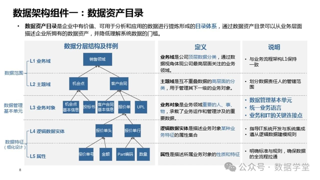 关于数据资产目录的架构建立,可参考业务流程架构,如果企业还没有建立流程架构,可以按企业业务板块,形成数据资产架构的最上层——数据主题域,比如研发或IPD主题域、营销或LTC主题域、人力资源主题域。