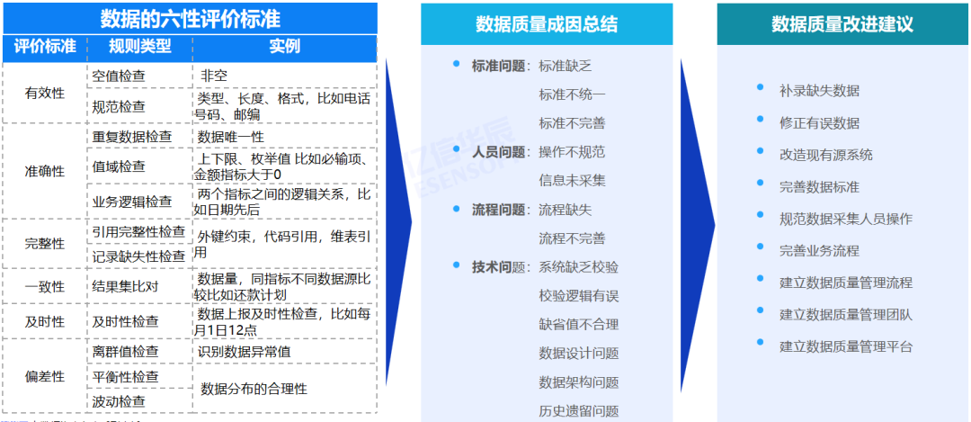 第一时间就是要调研企业的数据有哪些内容,现在存在什么样的数据问题,然后根据治理动作来制定相应的蓝图;同时企业也要建立相应的管理组织,然后摸清整个企业的数据现状,进行相应的数据标准、数据质量、数据安全等能力的提升,建立起闭环式的覆盖数据治理咨询规划、方案制定、执行和评价的数据治理统一流程。