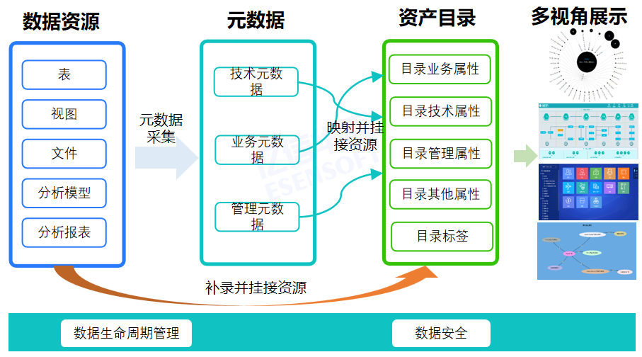 元数据管理智能和人工补录完善的方式盘点全部数据资源,资产目录的活化功能保证目录能及时的反映资产结构的变化。