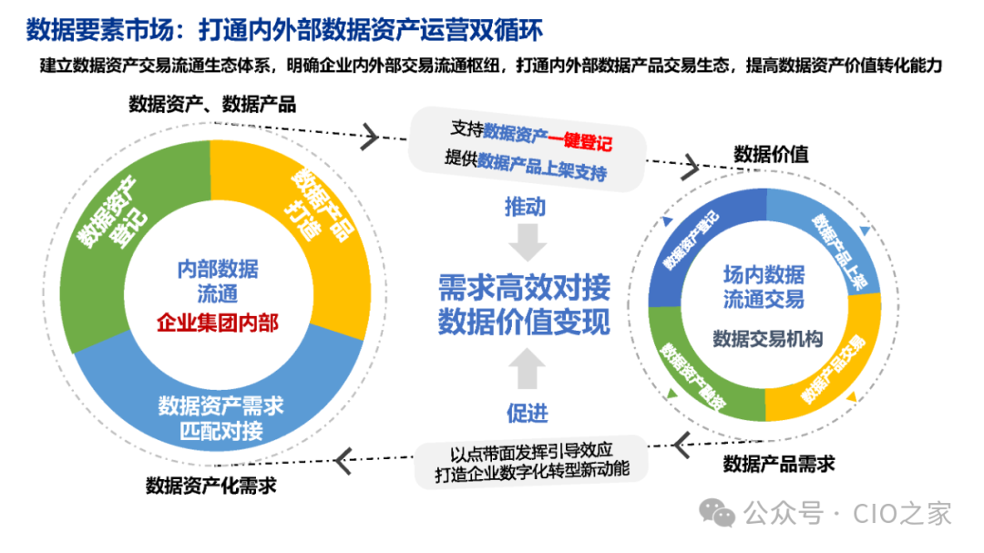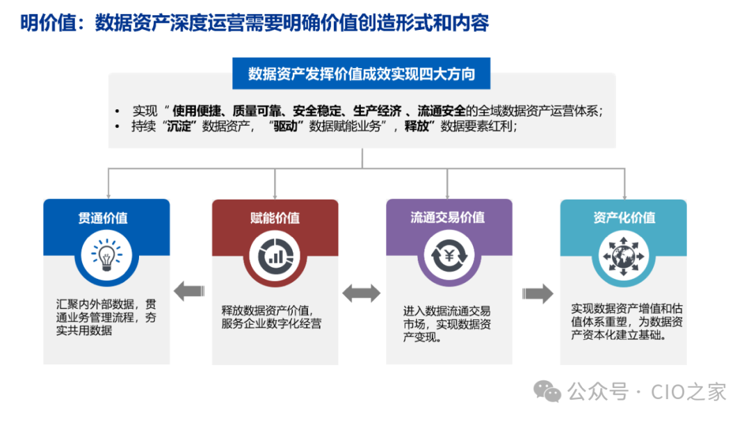 明价值:四大维度,全面释放数据红利 数据资产的价值是多元的,它可以从四个维度释放红利: 贯通价值:汇聚内外部数据,贯通业务管理流程,夯实共用数据 。    赋能价值:释放数据资产价值,服务企业数字化经营 。    流通交易价值:进入数据流通交易市场,实现数据资产变现 。    资产化价值:实现数据资产增值和估值体系重塑,为数据资产资本化建立基础 。
