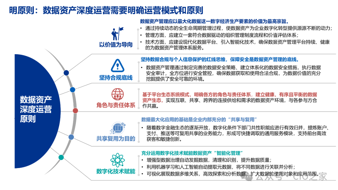 明原则:合规为基,价值为导数据资产的深度运营必须遵循一定的原则: 以价值为导向:最大化数据这一数字经济生产要素的价值 。    坚持合规底线:保障数据安全,确保数据获取和使用合法合规 。    角色与责任体系:建立健康、有序且平衡的数据资产生态 。    以共享复用为目的:实现企业内部充分的“共享与复用”,提升运营效率 。  数字化技术赋能:运用智能化技术,提升数据资产的管理水平 。