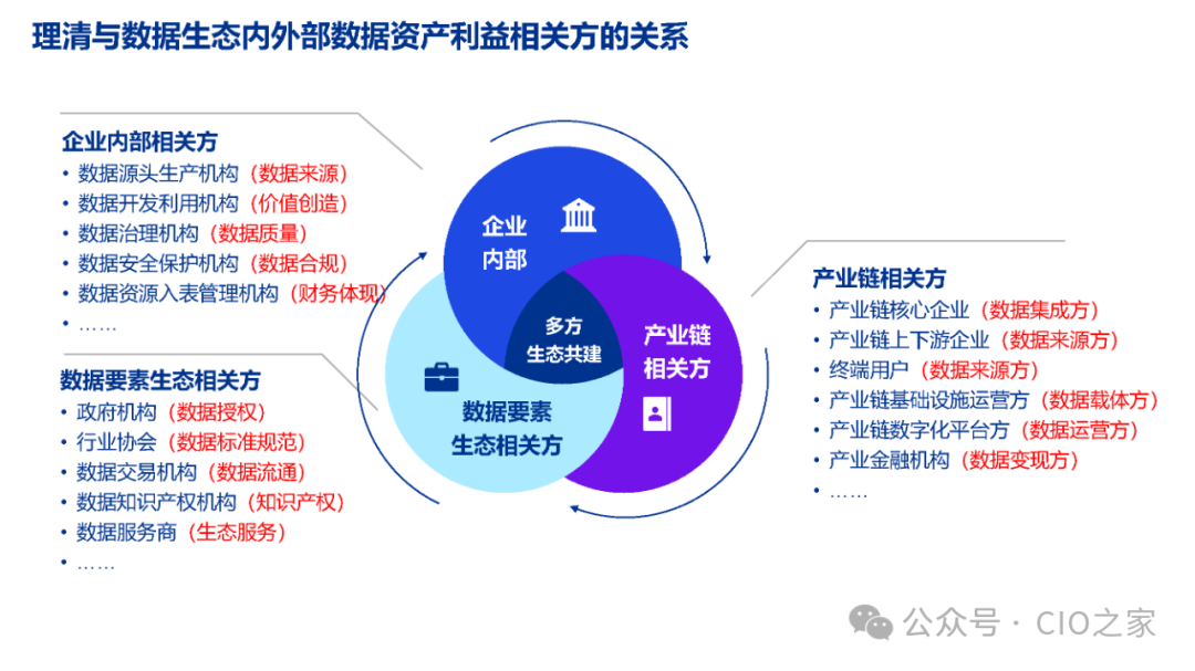 厘清利益相关方 数据要素生态涉及多方参与者: 企业内部相关方:数据源头生产组织、数据开发利用组织、数据治理组织、数据安全保护组织、数据资源入表管理组织等 。    产业链相关方:产业链核心企业、上下游企业、终端用户、基础设施运营方、数字化平台方、产业金融组织等 。    数据要素生态相关方:政府组织、行业协会、数据交易组织、数据知识产权组织、数据服务商等 。