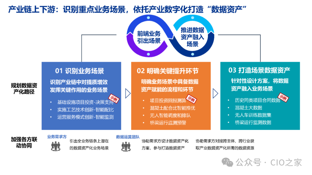 明方向:从业务数据化到数字产业化数据资产运营不是一蹴而就的。它伴随着企业数字化转型的进程,从最初的管理数字化、业务数据化,逐步开展到数据资产化,最终实现数据资本化驱动的数字产业化 。这是一个不断演进的过程,企业需要在产业数字化的不同环节中,明确数据资产的产出规划,才能在数字经济中占据领先地位。