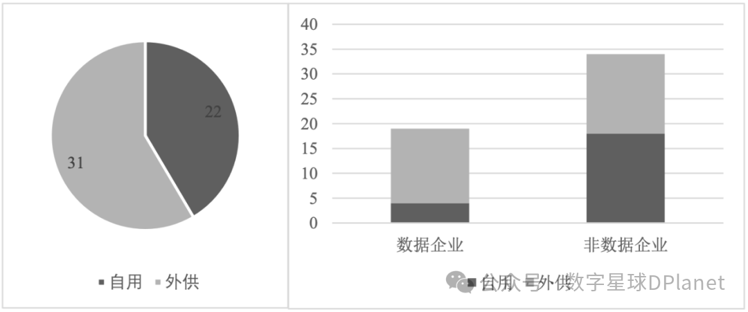 本文进一步将企业划分为数据企业和非数据企业,其中,数据企业是指企业经营范围或主营业务包含数据服务、数据处理、数据运营等数据相关业务。最终筛选出19家数据企业和34家非数据企业。可以发现,对于非数据企业而言,数据资产自用和外供比例相对接近;对于数据企业而言,大多数据资产是用于对外给予数据向日葵色版视频在线观看免费或服务,这与数据企业的业务性质比较契合。