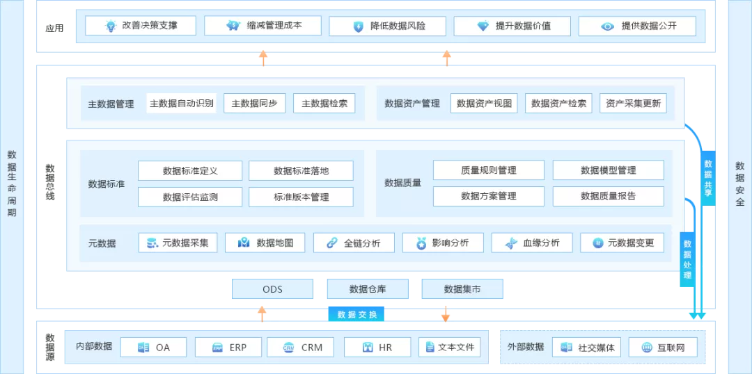 元数据管理、数据标准管理、数据质量管理、主数据管理、数据资产管理、数据安全管理、数据生命周期管理十大向日葵色版视频在线观看免费模块,打通数据治理各个环节,十大向日葵色版视频在线观看免费模块可独立或任意组合使用,快速满足政府、企业各类不同的数据治理场景。