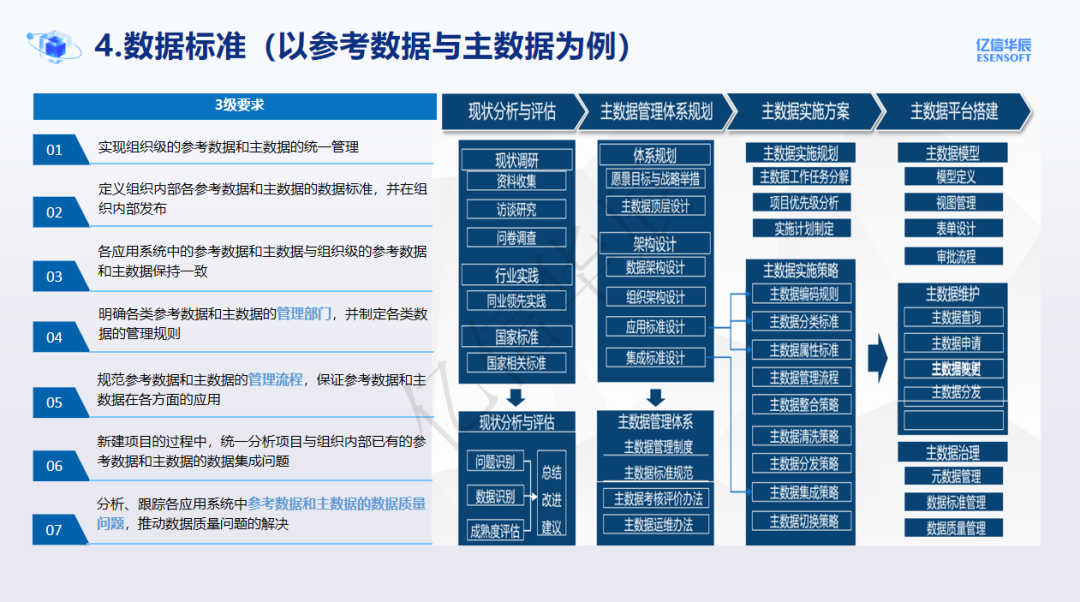 在众多的数据治理方法论中,数据标准是个比较特殊的模块,不同的DG体系数据标准的差异较大,例如在DAMA中就没有单独的数据标准模块,而在DCMM中将数据标准置为一级能力域。以参考数据与主数据为例,Ebpay在落地时会重点关注主数据整体的现状分析评估、管理体系规划、实施方案设计和MDM平台落地,是一个完整的链路流程。