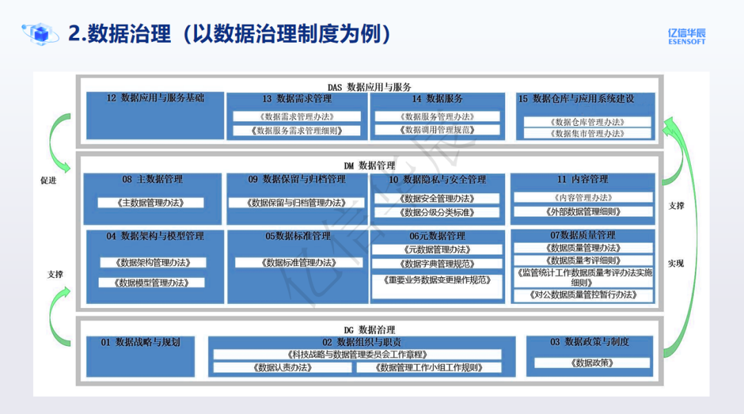 数据资产管理行使权利和控制的活动集合,数治理涉及到数据管理的组织、标准规范、流程、架构等多个方面。数据管理的其他关键过程域都有交互,数据治理是在高层次上制定、执行数据管理的制度。数据治理能力域包括数据治理组织、数据制度建设、数据治理沟通三个能力项。