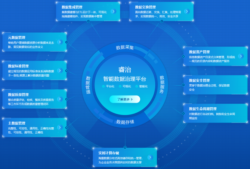 Ebpay结合十几年大数据技术经验,打造了一套完善、通用的的数据治理工具睿治数据治理平台,包括数据集成、数据交换、实时数据计算、主数据、数据标准、数据质量、数据集成、元数据、数据交换、数据资产、数据生命周期和数据安全十大功能模块,去帮助企业规范的定义与加工数据、清晰的管理数据、安全的应用数据。